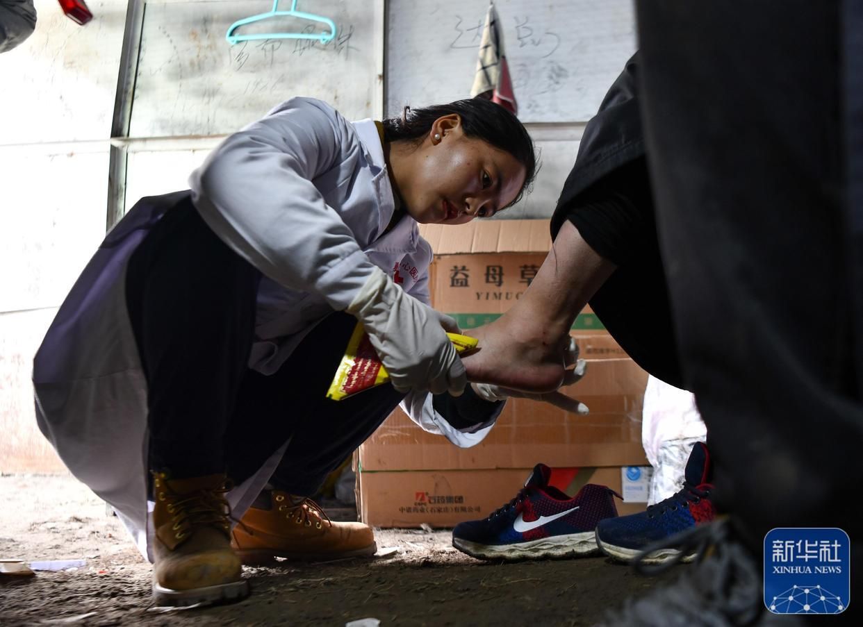 西藏那曲市比如縣良曲鄉(xiāng)然木塘村蟲草采集點(diǎn)的營地里,政府為采集點(diǎn)配備的醫(yī)護(hù)人員在給采集蟲草時(shí)受傷的牧民治療(5月26日攝)。新華社記者 晉美多吉 攝